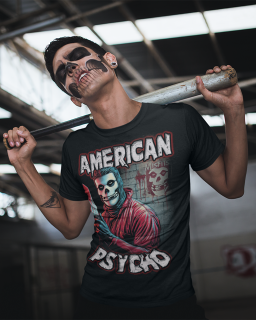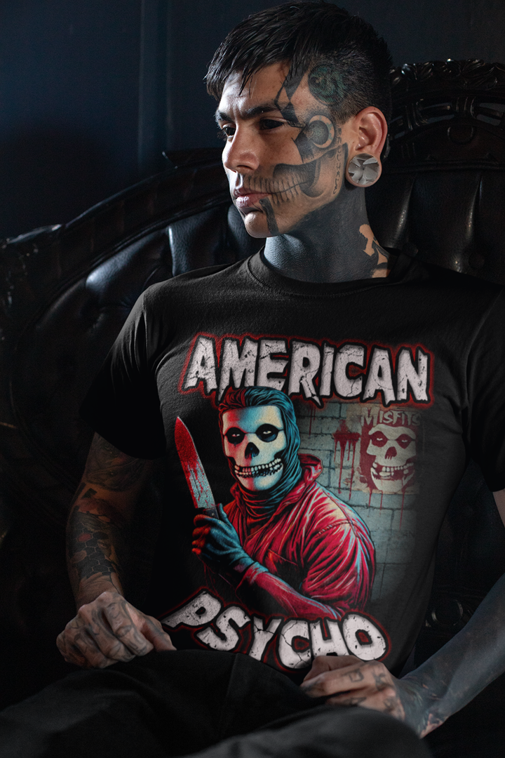 The American Psycho tee by Rejected Youth Co. is a straight-up horror punk banger — a slasher-style mashup built for fans of Misfits, cult horror, and bootleg mayhem. With a grinning ghoul in a blood-soaked jumpsuit and DIY stencil vibes on the wall, this one hits like a lost VHS tape soaked in gasoline.