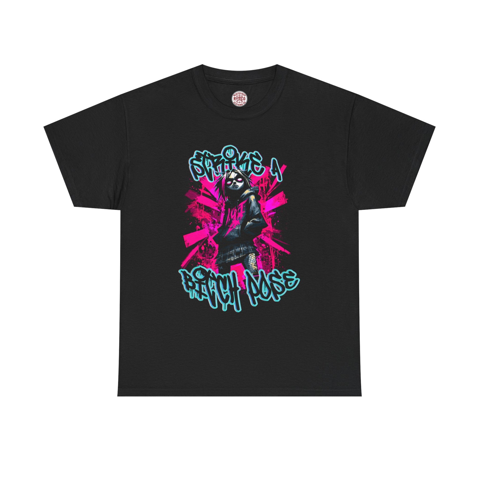 Rule the streets with attitude in the Strike a B**h Pose* tee — a bold, graffiti-inspired design that blends goth, punk, and grunge streetwear vibes. Featuring a fierce illustrated character with neon pink and electric blue accents, this shirt is perfect for anyone who lives life unapologetically. Made for fans of alternative fashion, Y2K style, and rebellious self-expression, this graphic tee pairs perfectly with ripped jeans, plaid skirts, or layered streetwear looks. Whether you’re at a gig, skating with friends, or just making a statement, this shirt says it all without you having to say a word.